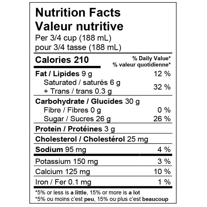 Buttermilk, Cream, Sugars (sugar, corn syrup solids, glucose, glucose-fructose, icing sugar), Skim milk powder, Water, Modified corn starch, Salt, Potassium sorbate, Sodium benzoate, Citric acid, Fractionated palm kernel oil, Corn starch, Soy lecithin, Natural and artificial flavour, Mono & diglycerides, Guar gum, Xanthan gum, Carrageenan, Gum arabic, Carnauba wax, Titanium Dioxide, Brilliant blue FCF, Allura red, Tartrazine, Sunset yellow FCF, Erythrosine