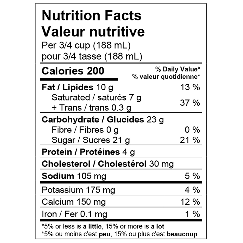 Buttermilk, Cream, Sugars (sugar, corn syrup solids, glucose), Skim milk powder, Egg yolks, Milk ingredients, Butter, Natural and artificial flavour, Mono & diglycerides, Guar gum, Xanthan gum, Carrageenan, Potassium sorbate, Sunset yellow FCF, Tartrazine, Caramel