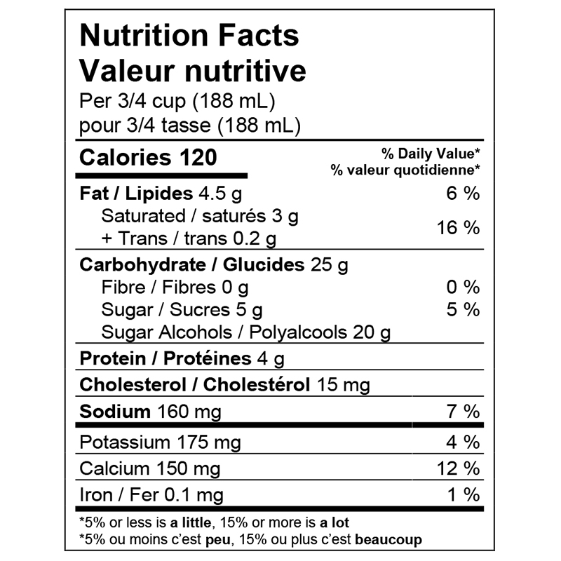 Buttermilk, Maltitol syrup, Cream, Skim milk powder, Water, Maltodextrin, Sorbitol, Modified corn starch, Coffee, Salt, Mono & diglycerides, Guar gum, Xanthan gum, Carrageenan, Chicory root extract, Apple cider concentrate, Natural and artificial flavour, Caramel