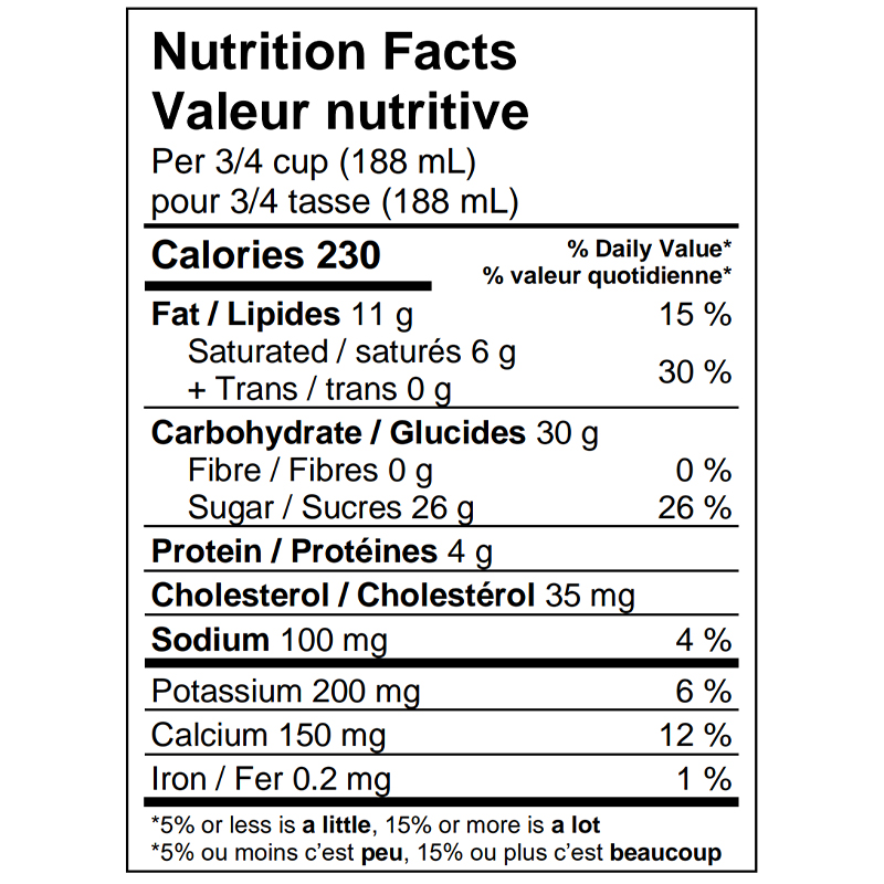 Buttermilk, Cream, Sugars (sugar, corn syrup solids, brown sugar, glucose, glucose-fructose), Cinnamon cake pieces (enriched flour, sugars [sugar, brown sugar], pasteurized eggs, butter, soybean oil, cornstarch, cinnamon, salt, soy lecithin), Skim milk powder, Water, Modified corn starch, Salt, Potassium sorbate, Sodium benzoate, Citric acid, Cinnamon, Mono & diglycerides, Guar gum, Xanthan gum, Carrageenan, Natural and artificial flavour, Titanium dioxide, Caramel