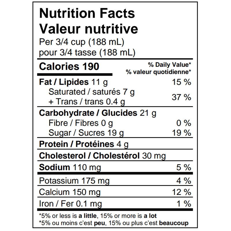 Buttermilk, Cream, Sugars (sugar, corn syrup solids), Skim milk powder, Natural and artificial flavour, Mono & diglycerides, Guar gum, Xanthan gum, Carrageenan, Caramel