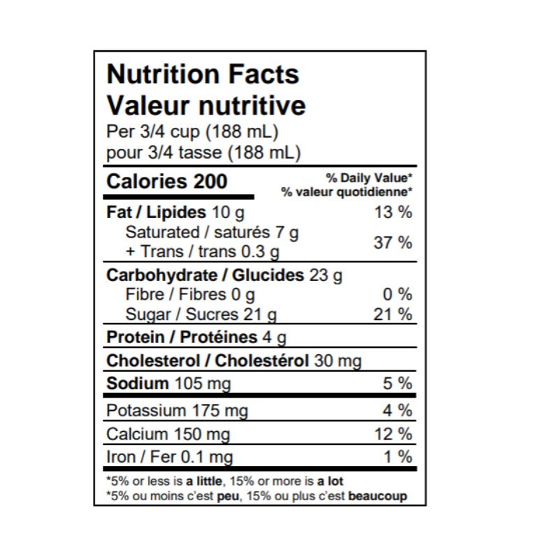 Buttermilk, Cream, Sugars (sugar, corn syrup solids, glucose), Skim milk powder, Egg yolks, Milk ingredients, Butter, Natural and artificial flavour, Mono & diglycerides, Guar gum, Xanthan gum, Carrageenan, Potassium sorbate, Sunset yellow FCF, Tartrazine, Caramel