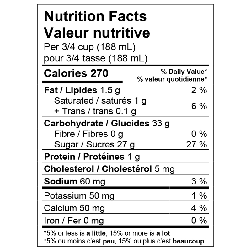 Buttermilk, Sugars (sugar, corn syrup solids), Water, Cream, Natural and artificial flavour, Citric acid, Mono & diglycerides, Guar gum, Xanthan gum, Carrageenan, Erythrosine, Amaranth, Tartrazine, Brilliant blue FCF, Sunset yellow FCF